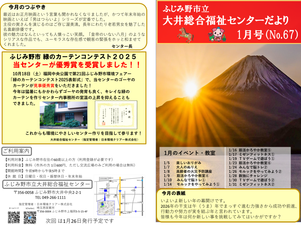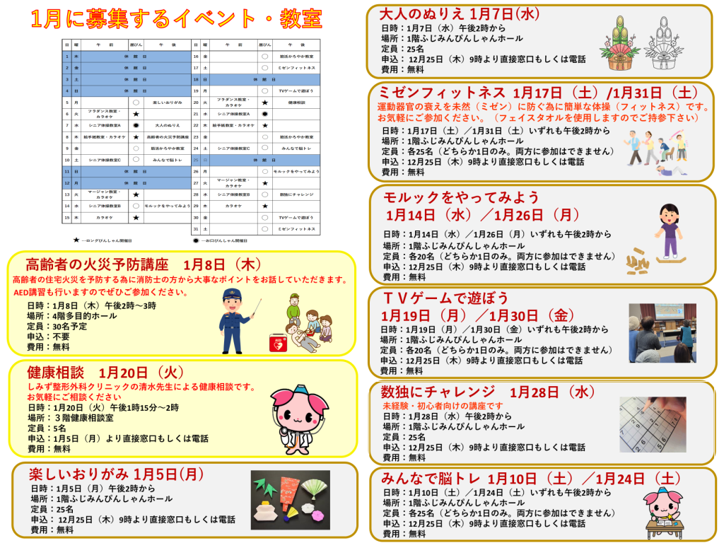 1月8日(木)は消防士の方がセンターにお越しになり、高齢者の火災予防講座・AED講座(無料・多目的ホール)があります。定員30名となりますのでご興味のある方は是非、参加してください!